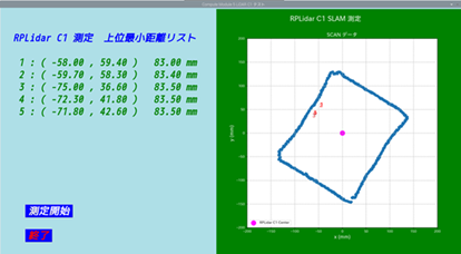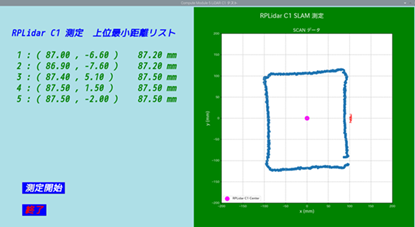 左側の最小距離リストは、Lidar中心から距離の短い点の上位5点の、座標と距離です。